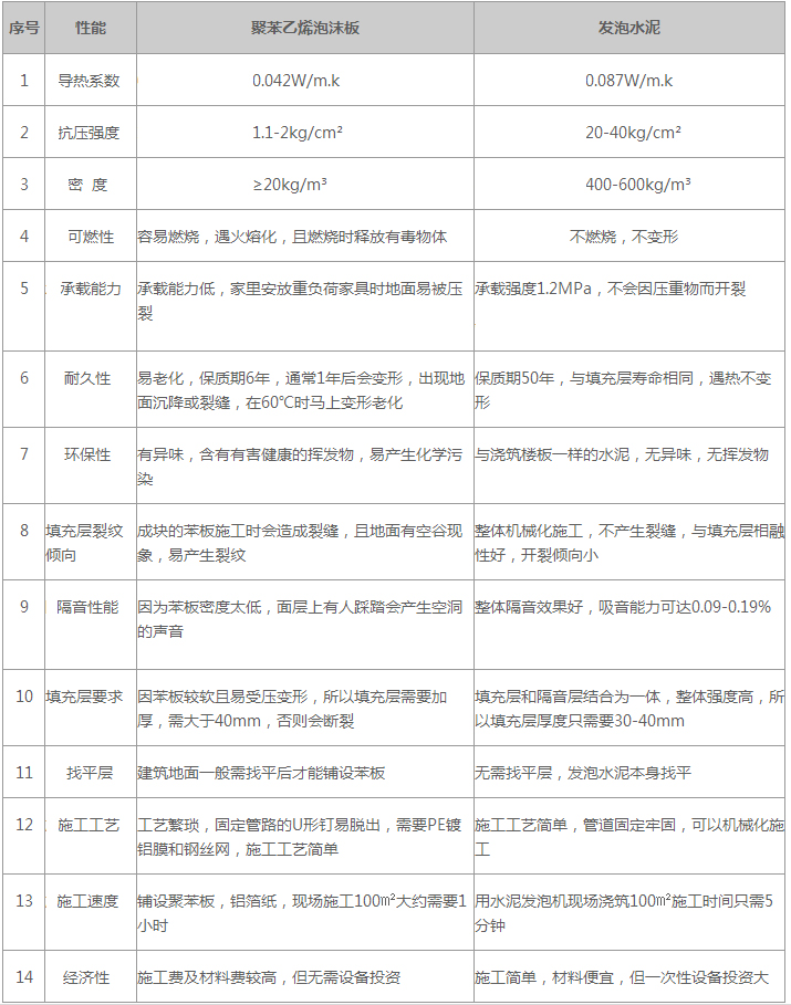 按照中華人民共和國行業標準《地面輻射供暖技術規程》JGJ142-2004中對地面采暖絕熱材料的要求是:“絕熱材料應采用導熱系數小,難燃或不燃,具有足夠承載能力的材料,且不宜含殖菌源,不得有散發異味及可能危害健康的揮發物”。我們對兩種不同的材料做以下對比: